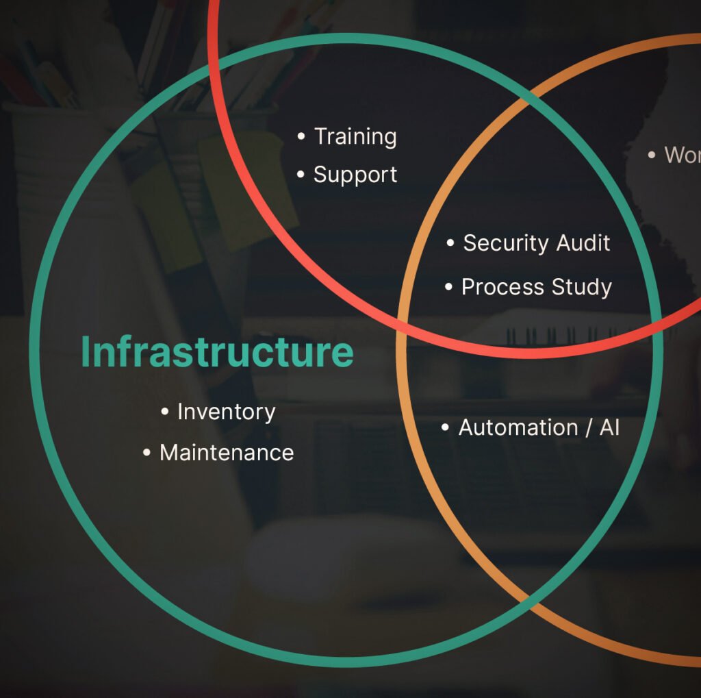 Setag’s infrastructure services include assisting clients in maintaining IT operations: the physical and virtual resources, including hardware, software, telephony, and networking components, that support the flow, storage, processing, and analysis of data. Some IT teams become consumed with “fighting daily fires,” which may delay projects or maintenance. Setag can help augment the local team with experienced professionals to complete those plans or tasks.